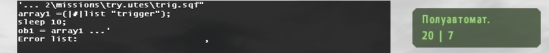 Quote (sanyokbig) Если триггер был поставлен в редакторе, а не создан динамически, то его имя берется в кавычки. Что означает не Code array1 = list trigger; а Code array1 = list "trigger"; Сообщение отредактировал sanyokbig - Четверг, 10.05.2012, 23:06